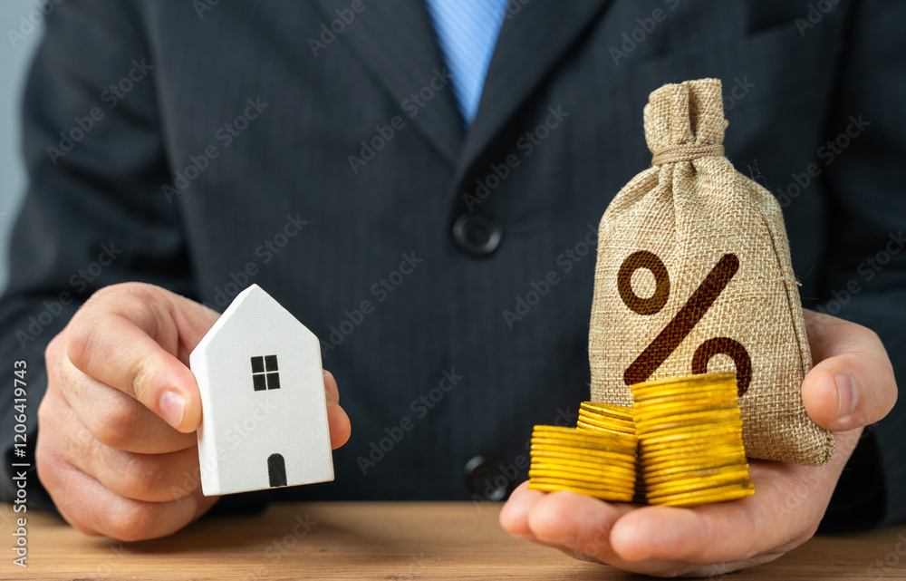 A man holds a money bag loan and a figurine of a white house. Buy a house in installments or with a mortgage loan. Investment in rental property. Buy housing.