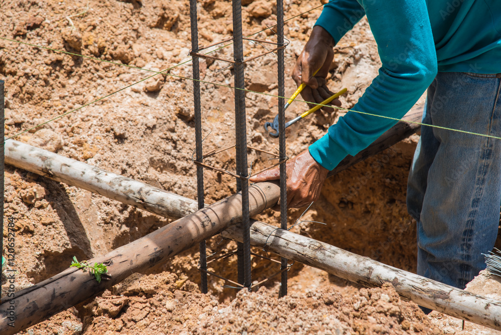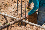 Construction workers are steel tie,Construction builder at work. Tying reinforcement preparation for concreting.