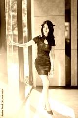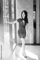Asian woman wearing traditional cheongsam dress. Portrait of female model. Happy Chinese New Year.