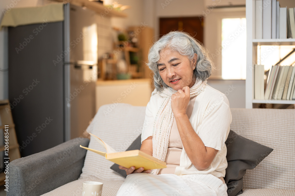 A relaxed Asian retired senior woman enjoys reading a book on a sofa in the living room.