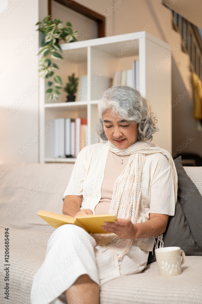 A happy Asian retired senior woman relaxes on a sofa, enjoying reading a book in the morning at home