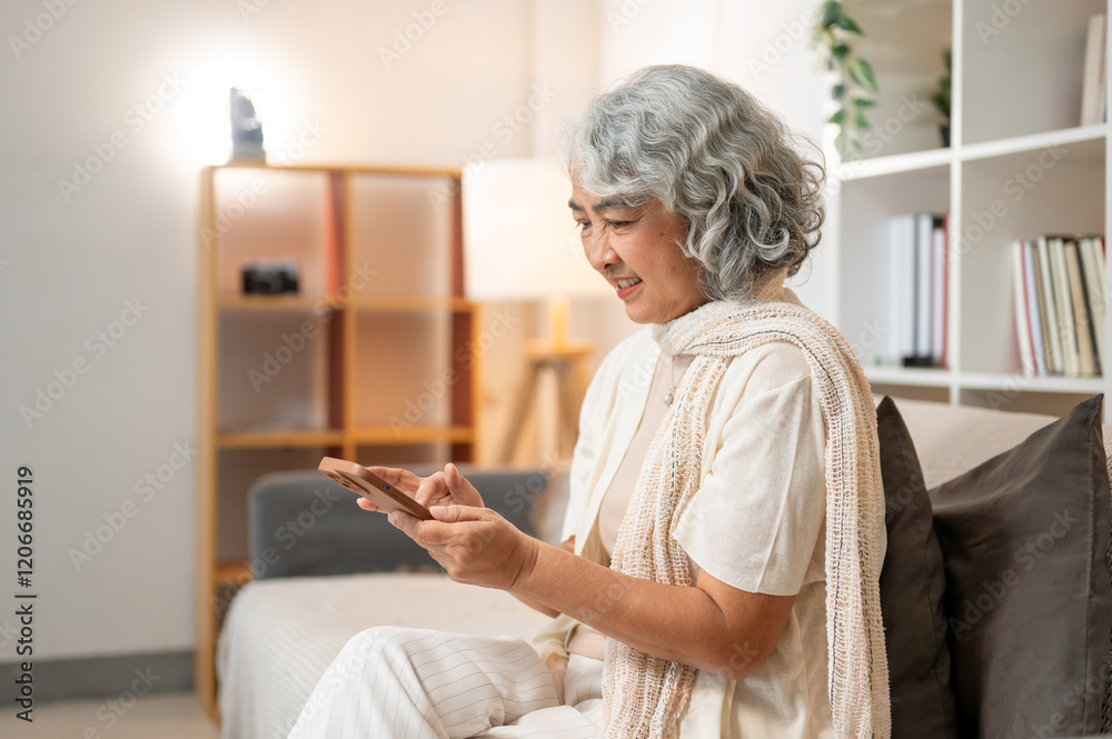 A happy Asian senior woman uses her smartphone to chat on social media while sitting on a sofa.