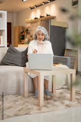 A happy Asian senior woman uses a laptop while sitting on a sofa in the living room.