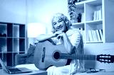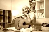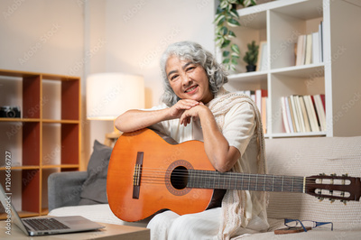 A beautiful, happy Asian retired woman sits on a sofa in the living room with her acoustic guitar.