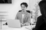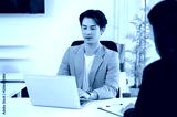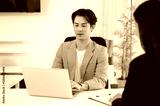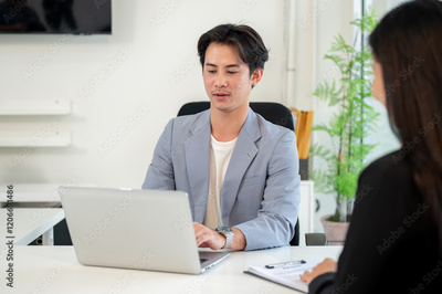 A professional Asian businessman is working on his laptop while interviewing a candidate in office.