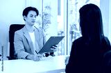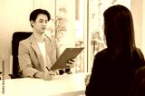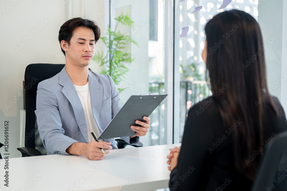 A professional Asian businessman reviews a candidate's resume carefully during an interview.