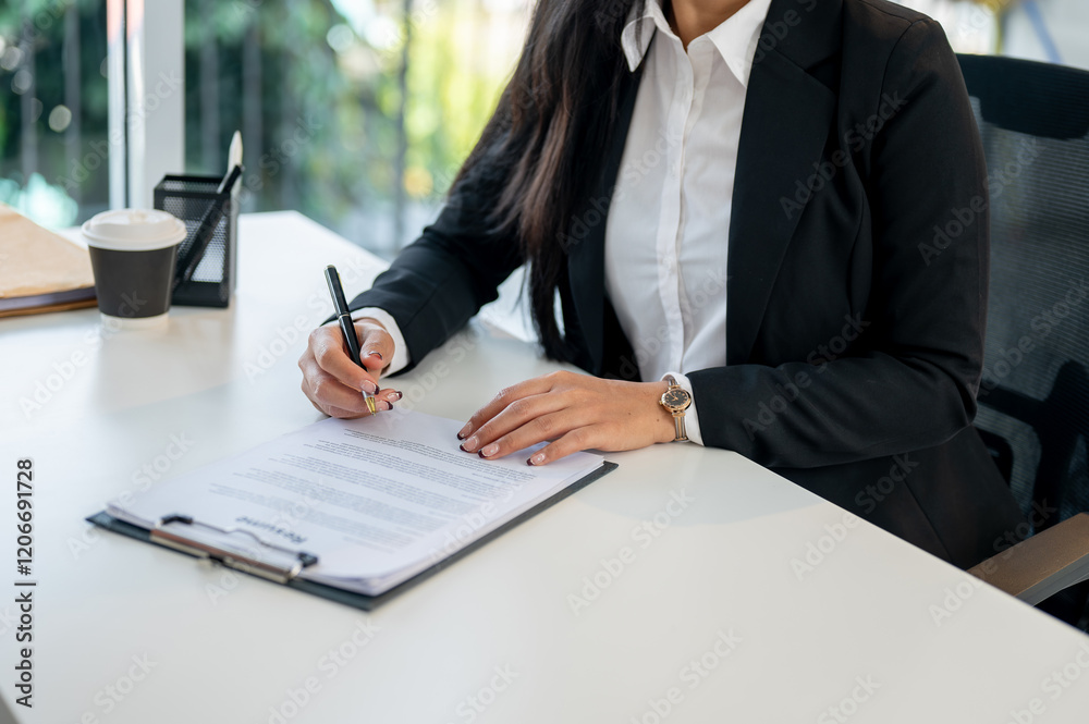 A close-up of a female candidate signing a job contract after the interview in the office.