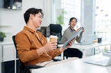 A positive Asian male office worker reading a document while enjoying a hot drink at his desk.