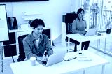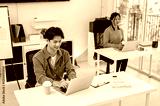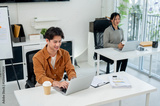 A handsome Asian businessman works on his laptop in the office alongside his colleagues.