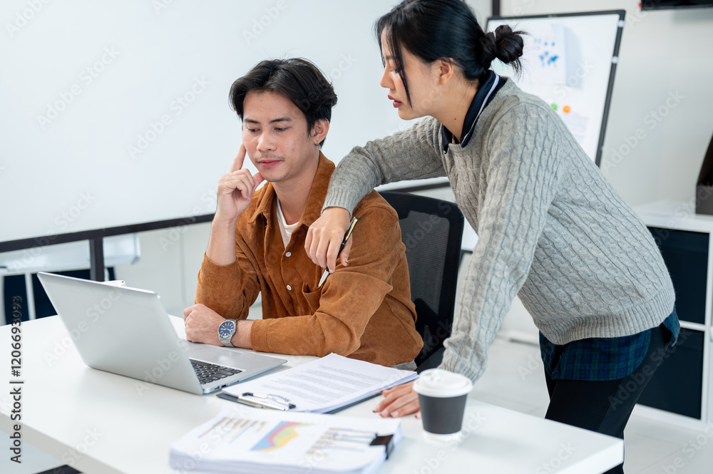 Two serious Asian businesspeople look at a laptop screen, brainstorming solution to fix the problems