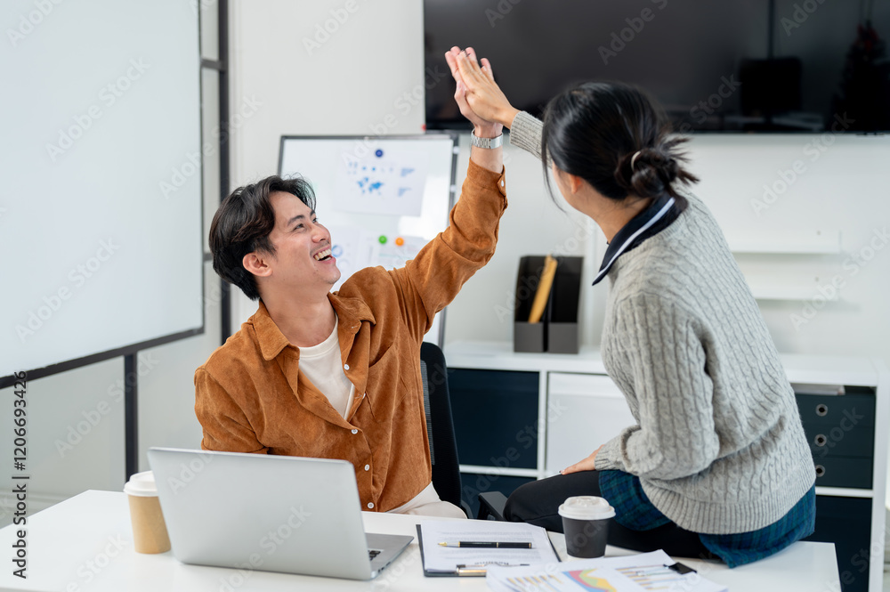 Two happy Asian businesspeople are in the office, giving each other a high five.