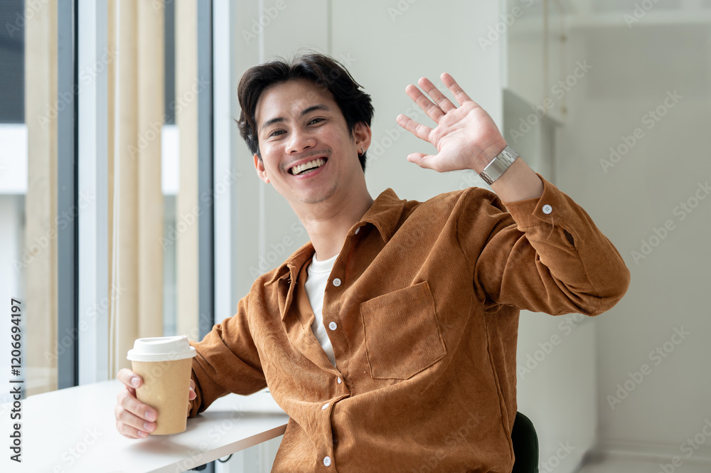 A cheerful, handsome Asian man sits in a coffee shop with a coffee cup in his hand.