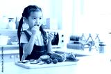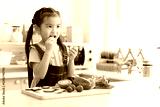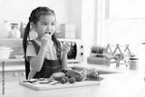 cute asian little child girl eating slice a cucumber with different vegetables in the kitchen