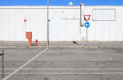 One way sign and give way sign in the empty parking lot. White concrete building on behind and a red fire hydrant with its symbol on the left. Background for copy space.