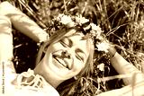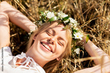 happy woman in wreath of flowers lying on straw