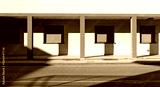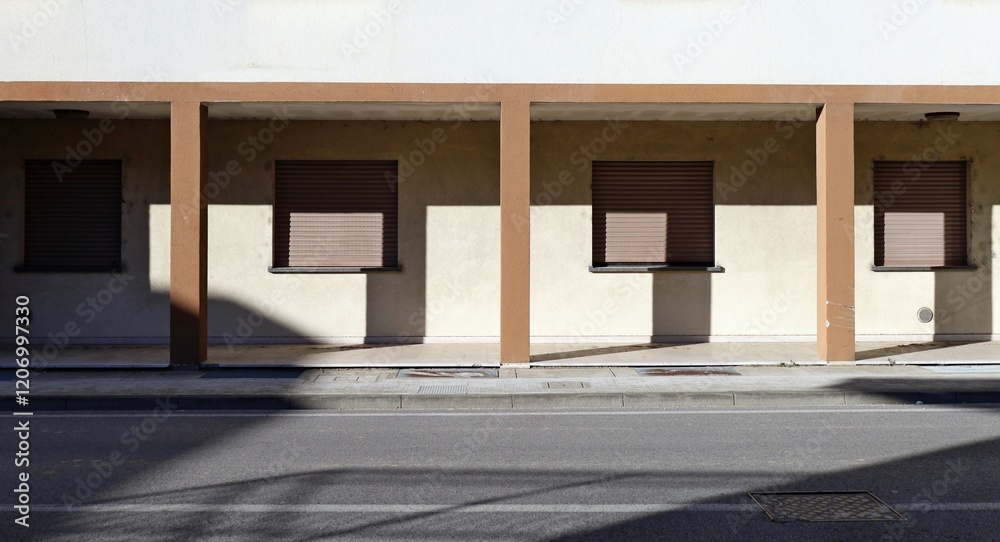 Brown plaster columns in front of old abandoned house porch with closed shutters at the roadside. Sidewalk and street in front. background for copy space.