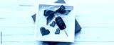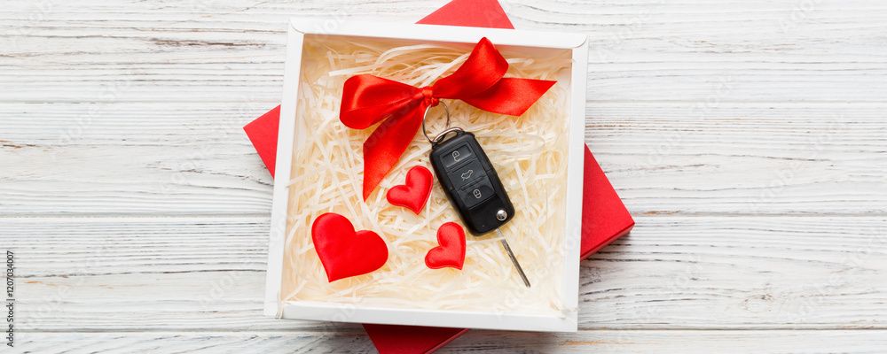 Black car key in a present box with a ribbon and red heart on colored background. Valentine day composition Top view