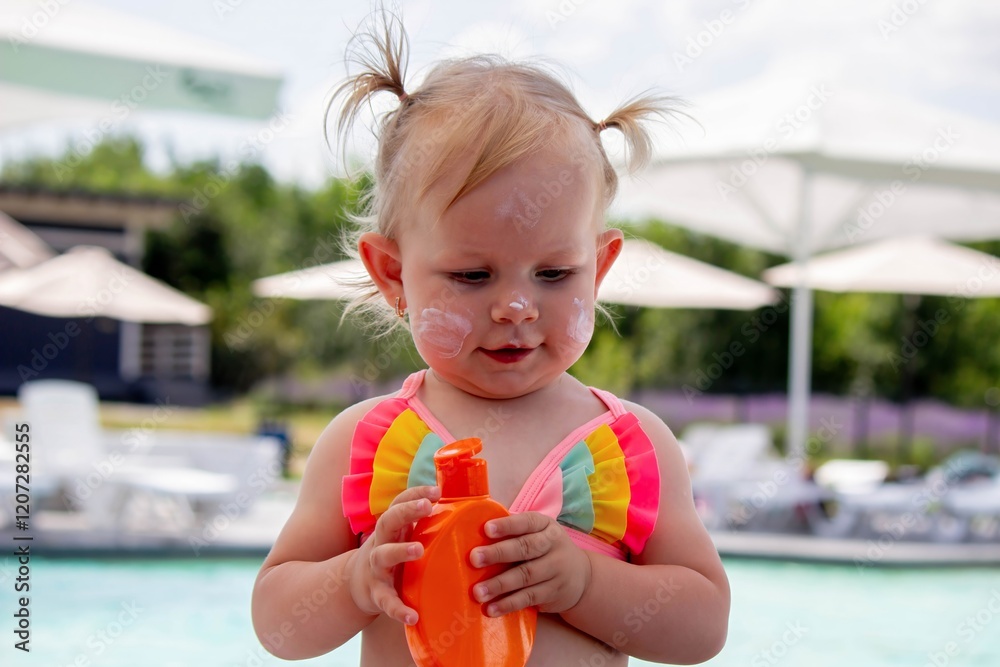 little girl near the pool and holding sunscreen. vacation