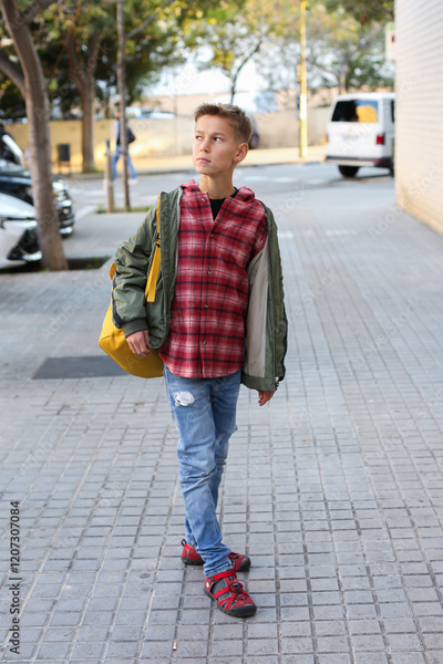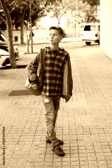 Teenager walking through the city, outdoors