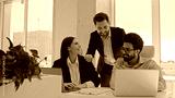 Mentor help colleagues with corporate work on laptop businessman teaching businesswoman analyze online project result discuss business development supervisor teach multiracial team managers at office