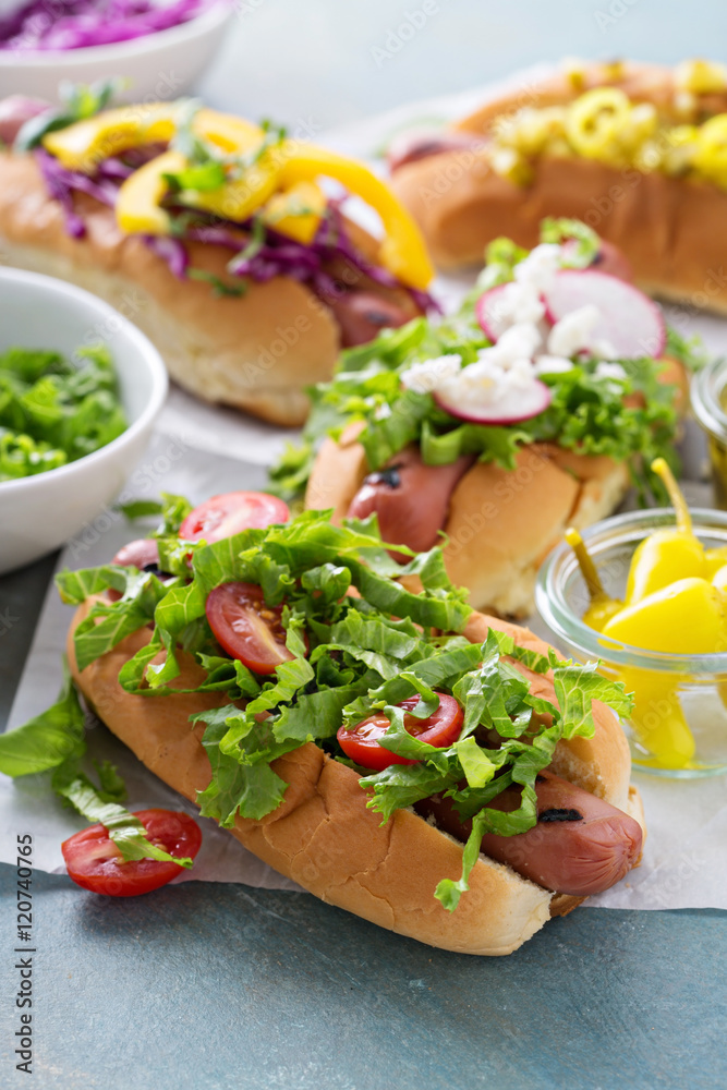 Variety of hot dogs with healthy garnishes