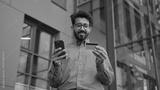 Happy Indian Arabian businessman use credit card online bank payment in city near office business customer entrepreneur man with mobile phone internet shopping buying easy pay money banking service