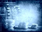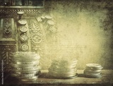 Antique style cash register and old coin. Great background on the historical and business topics.