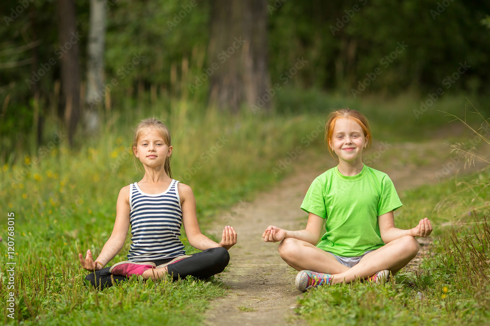 Two little cute yoga girls sitting in Lotus position outdoors.