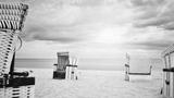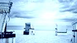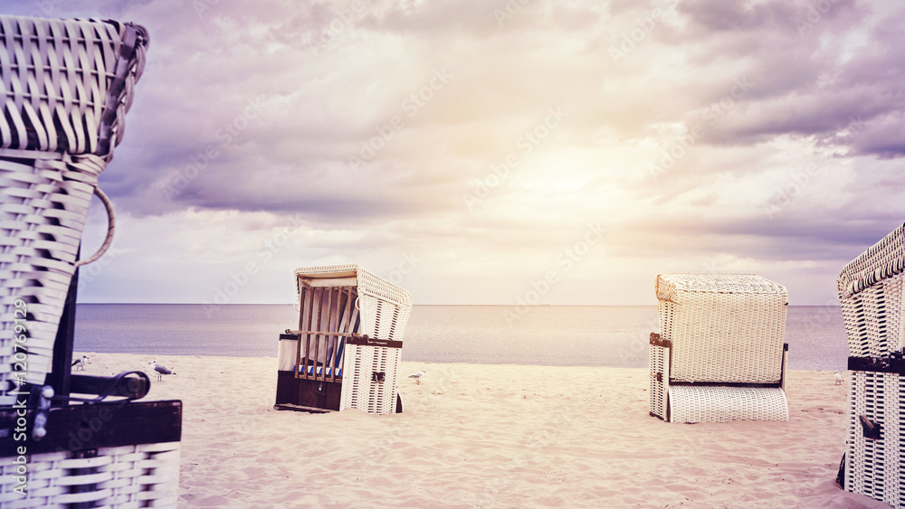 Purple vintage toned hooded wicker basket chairs on an empty beach.