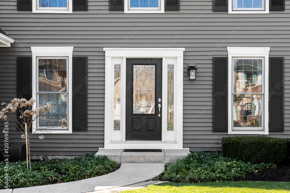 A front door detail on a dark grey suburban home with a black and glass front door, white windows, and a concrete sidewalk.