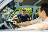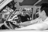 Man in car picking up his friend on the way to home
