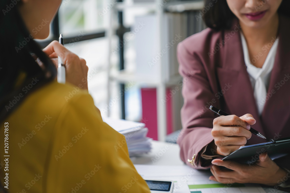 Businesswomen working together analyzing financial charts and taking notes during a meeting