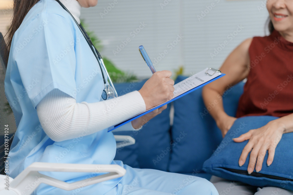 Doctor writing medical records on clipboard while visiting and examining senior patient at home