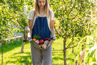 Woman Holding Vegetables and Homemade Preserves in the Garden
