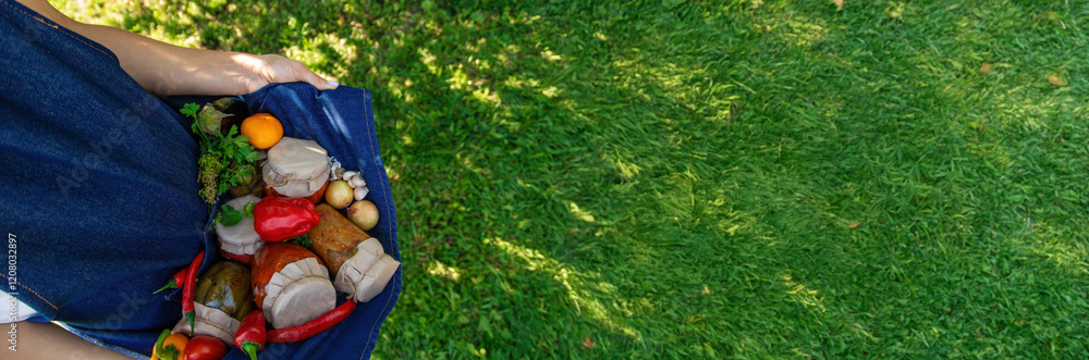 Woman Holding Vegetables and Homemade Preserves in the Garden