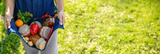 Woman Holding Vegetables and Homemade Preserves in the Garden