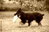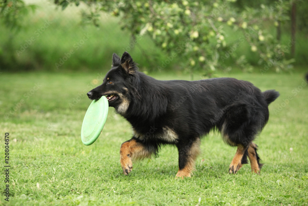 Beautiful Bohemian Shepherd running with a toy in the garden