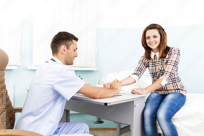 young woman on reception at the doctor. Male doctor examining a patient. The workplace of the doctor at the clinic