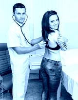 young woman on reception at the doctor. Male doctor examining a patient. The workplace of the doctor at the clinic