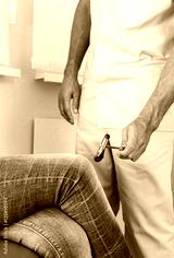 doctor prostukivet hammer knee female patient in his office medetsinkom. The doctor examines the patient's knee