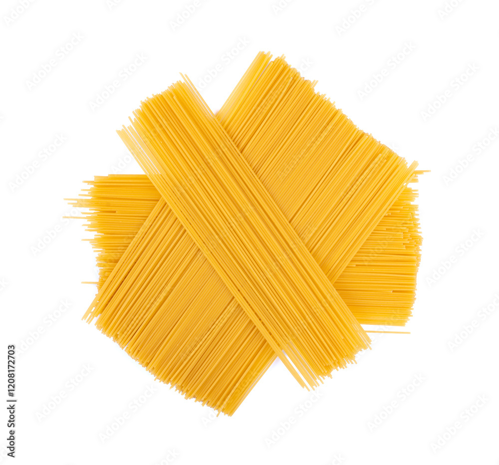 Raw spaghetti isolated, dry spagetti, long wheat noodles, uncooked italian macaroni bundle