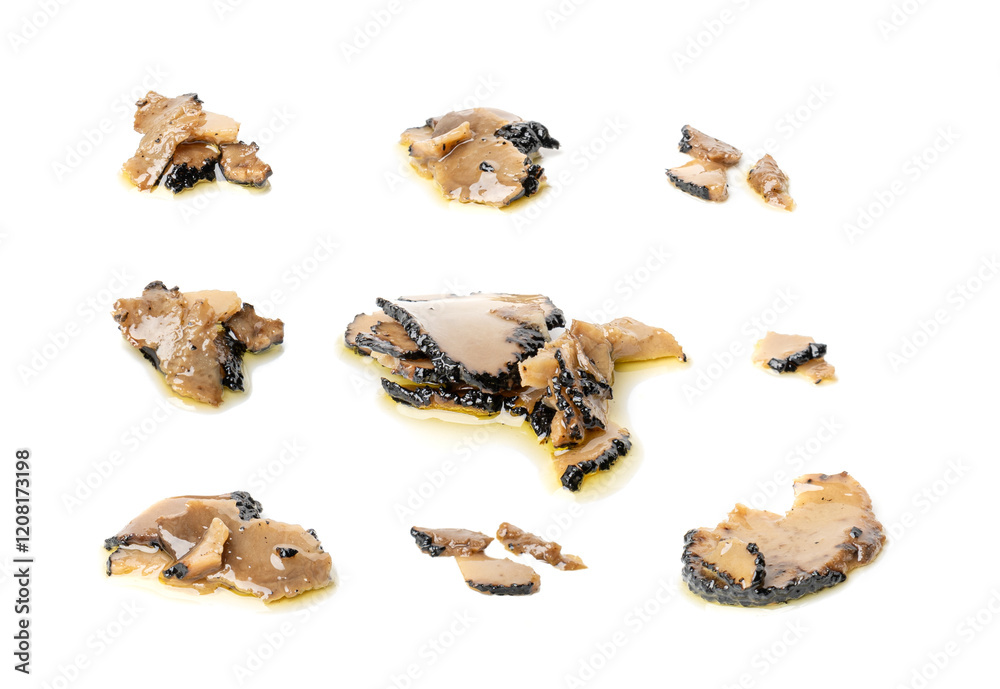 Truffle Slices Isolated, Tuber Melanosporum Mushroom Pieces in Oil, Canned Black Truffle