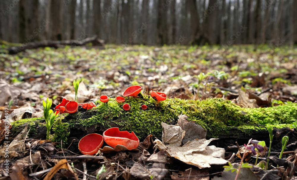 Spring edible red mushrooms Sarcoscypha grow in forest close up. sarcoscypha austriaca or Sarcoscypha coccinea - mushrooms of early spring season, known as Scarlet elf cup. fresh fungus picking