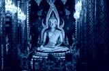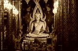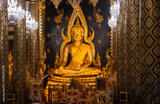 Golden Buddha statue in a richly decorated temple interior surrounded by ornate golden details, traditional patterns, and chandeliers, representing Buddhist culture and spiritual devotion