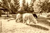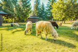 Sheep walks freely on a farm on a sunny day. Eco farm