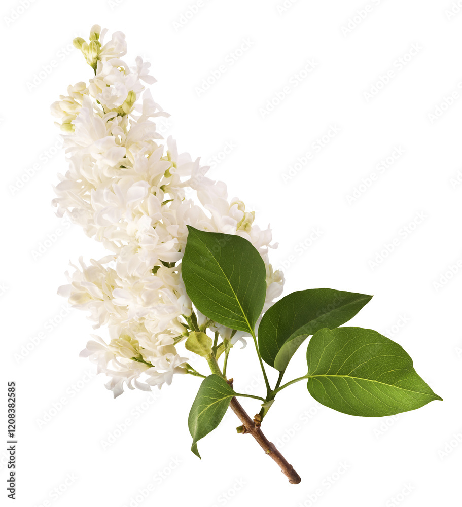Fresh lilac blossom, Beautiful white lilac flowers falling in the air isolated on white background. Zero gravity or levitation spring flowers conception, high resolution image