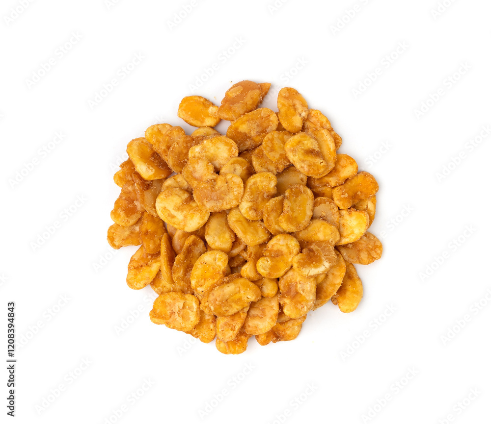 Roasted broad beans snack isolated, fried vicia faba, spicy legume, crispy big beans chips for salads