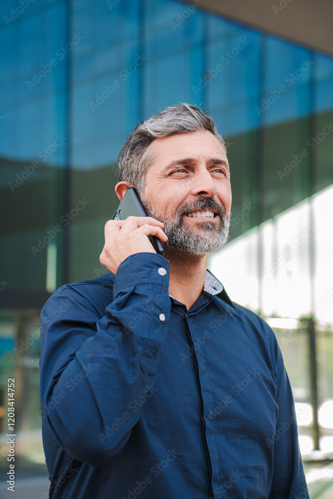 Confident mature man enjoying a phone conversation standing outdoors, showcasing a positive demeanor and engagement in communication, reflecting modern lifestyle and connectivity in everyday life
