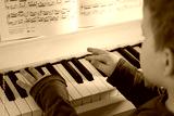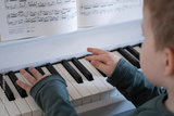 A child wearing a green sweater playing the piano while reading sheet music. This captures the learning process and love for music.