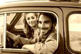 Loving couple in old blue car, young man is driving. Around classic landscape of Tuscany, Italy